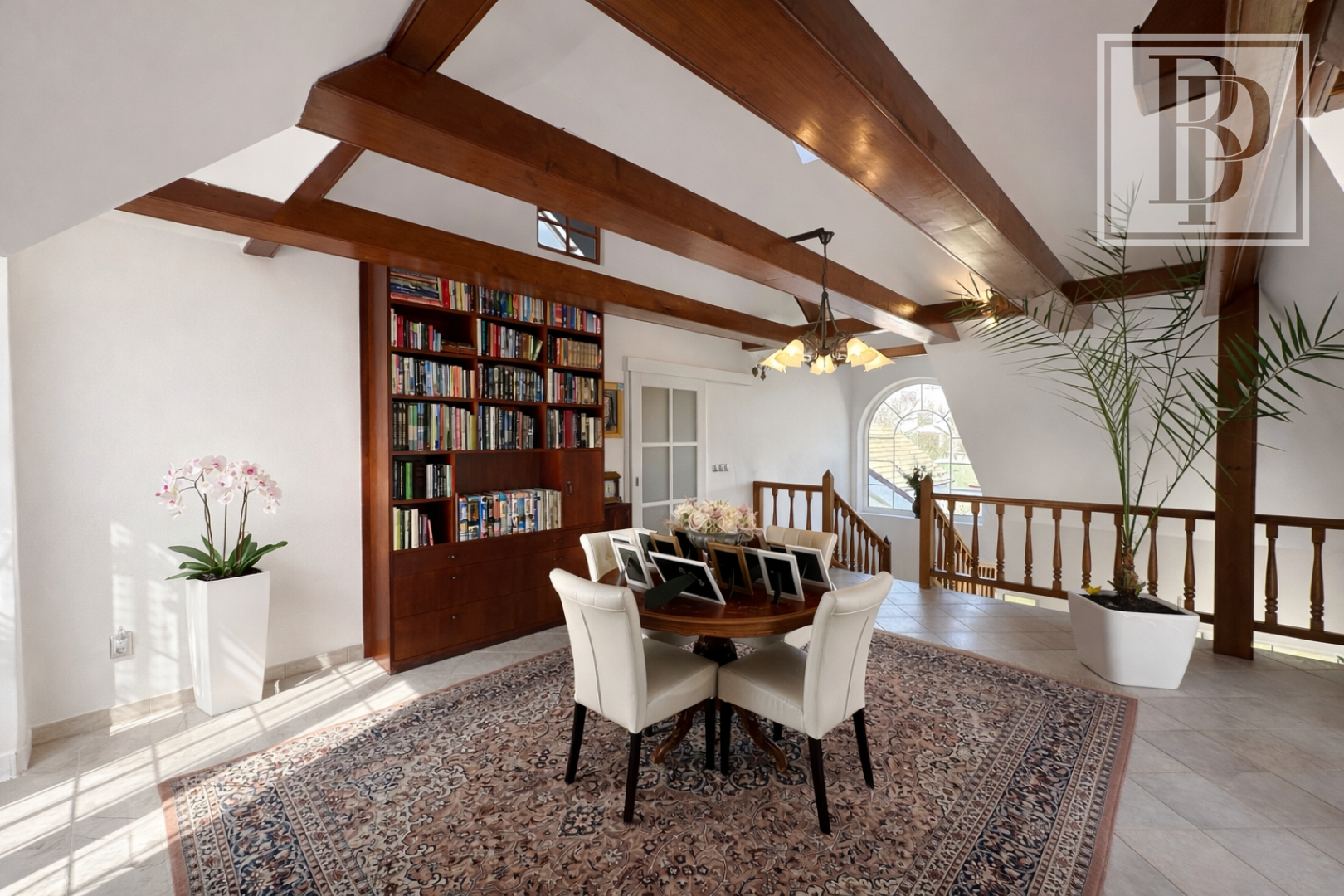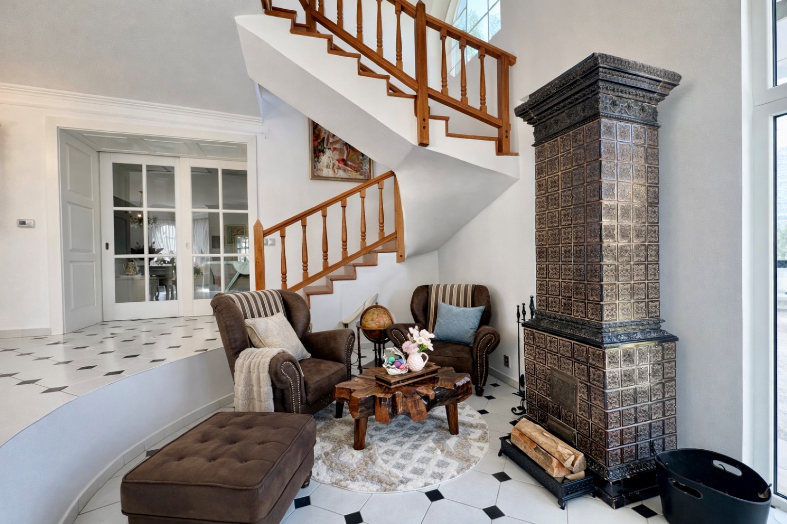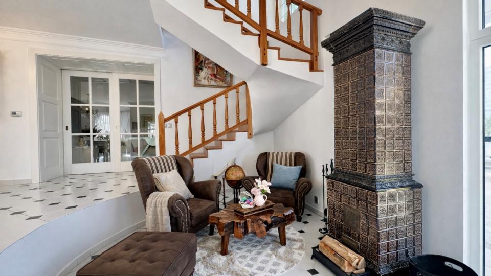 - Dominantou interiéru je otvorená hala s galériou a krbom, ktorá prirodzene prepája celý dom a vytvára jeho jedinečnú atmosféru.